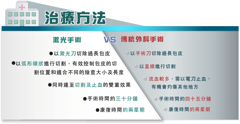 激光包皮環切手術是以激光刀代替手術刀,切除過長的包皮,此技術較傳統開刀手術優勝,激光刀能同時達至切割及止血的雙重效果。在切割方面,激光刀以弧形線狀進行切割,切口整齊,除了令醫生有效控制包皮的切割位置外,更適合不同的陰莖大小及長度,相較傳統手術刀以直線切割優勝。